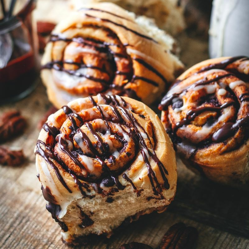 Valmista kuorrutteet sekoittamalla kummankin kuorrutteen ainekset yhteen omissa kulhossaan. Anna pullien jäähtyä minuutin verran ennen kuin käännät vuoan ylösalaisin ja kumoat pullat tarjoiluvadille. Käännä pullat uudelleen ja kaada niiden päälle ensin kanelikuorrutetta ja sitten suklaakuorrutetta.