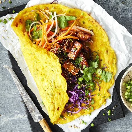 Nämä vegaaniset pannukakut ovat saaneet inspiraationsa kiinalaisesta Jian Bingistä ja vietnamilaisesta Bánh Xèosta. Ohuita lettuja, joissa on hienonnettua ruohosipulia taikinassa ja päällä raastettuja vihanneksia ja lasitettua tofua.