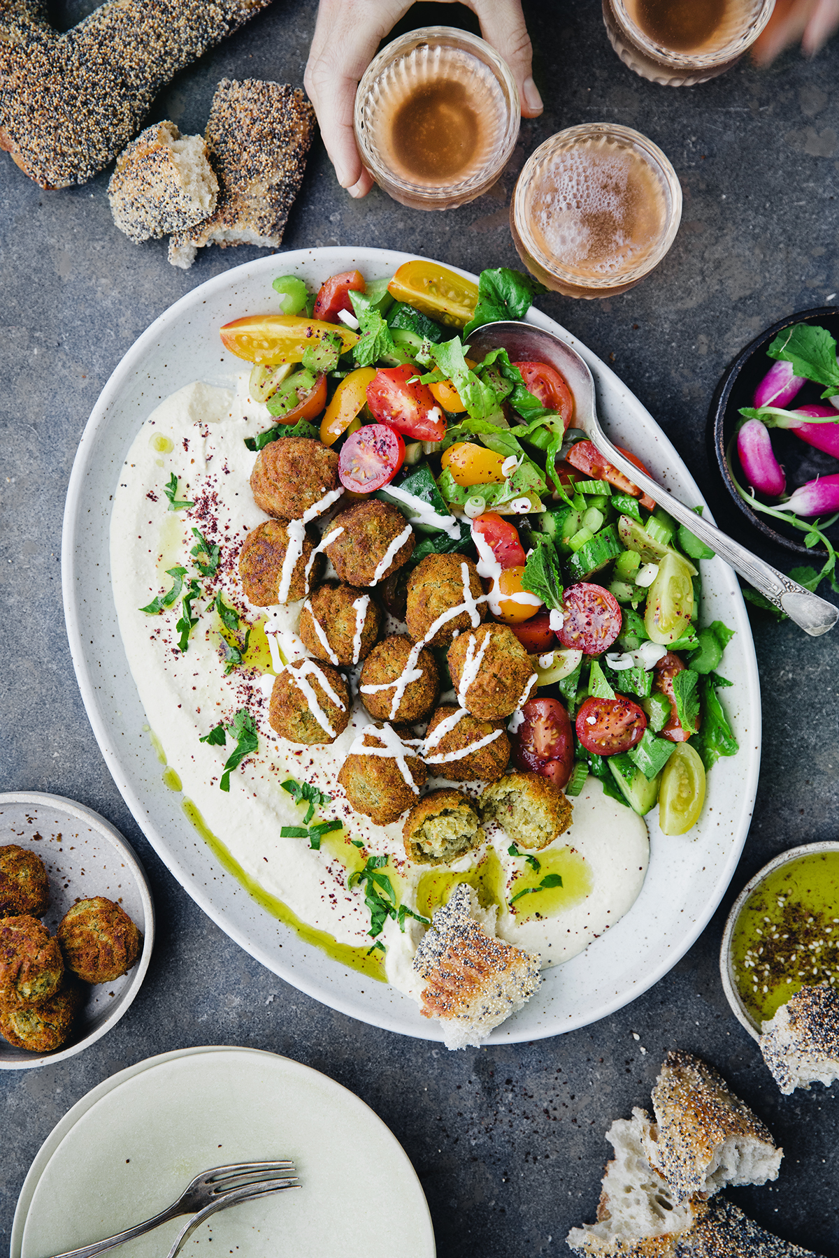 Kun tarjoiluvadilla on hummusta, värikästä, raikasta salaattia ja lämpimiä falafelpyöryköitä, ruoan on pakko maistua hyvältä. Tässä ohjeessa on käytetty sumakkia, mutta sen voi korvata sitruunankuorella ja ripauksella juustokuminaa.